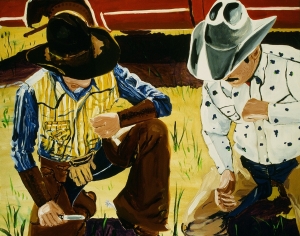 Two cowboys killing sometime playing mumbele pegs before chuck wangon comes by.