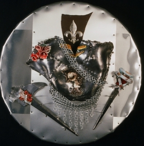 Breast plate to symbolize Joan of Arc Materials used ceramics, medal, leather and wood
