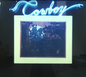 Rodeo cowboy Bobby Del Vecchio getting bucked off a bull at NfR. Smoked mirriored matt, and Neon light, Photo etching