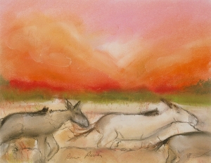 Mules moving through the desert. Actual image size H 8" x W 10"