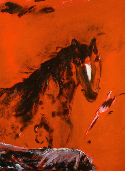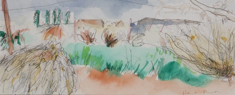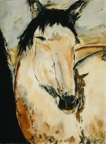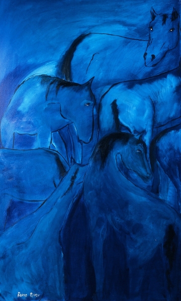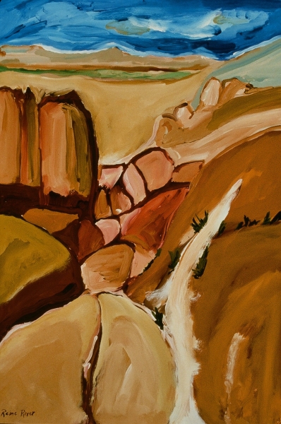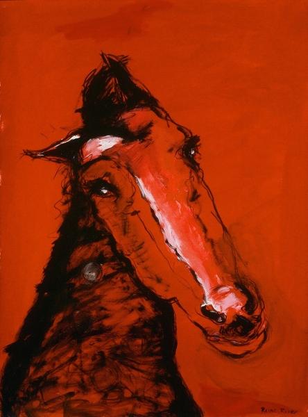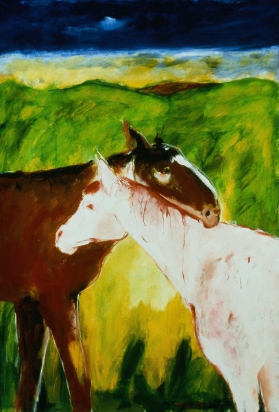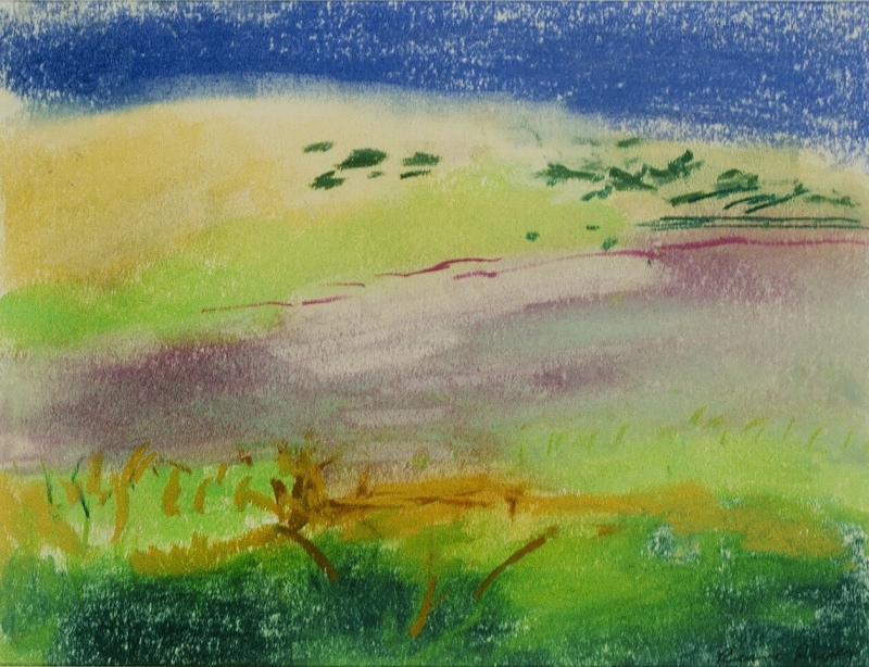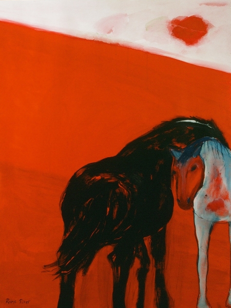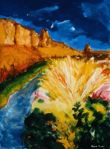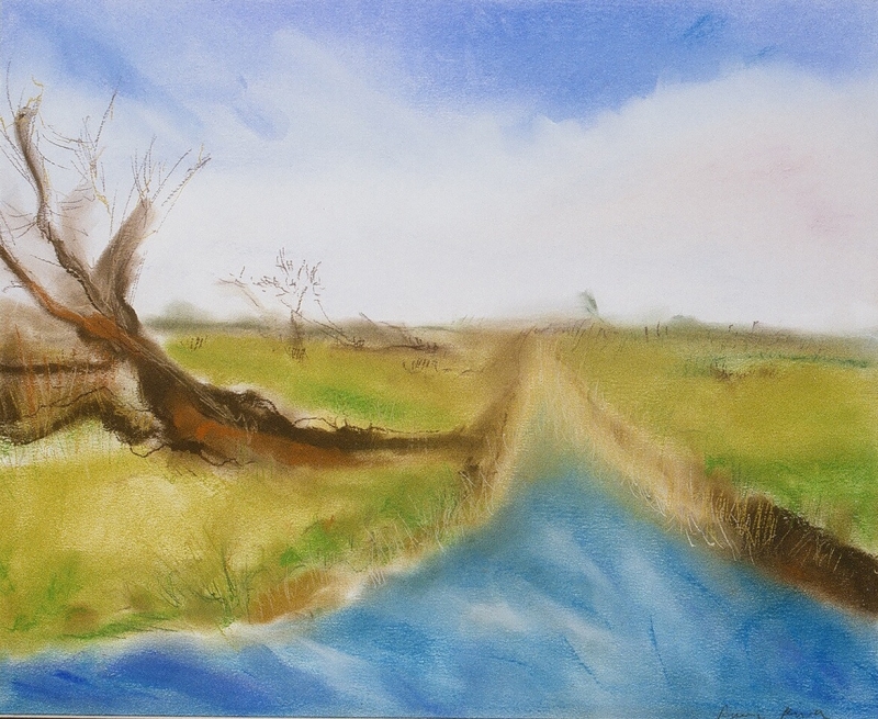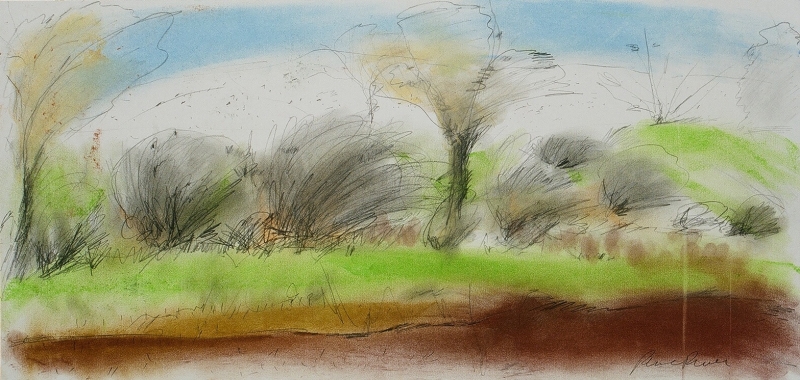 Landscape with a river running through and horses in the far background. Acrylic On Paper